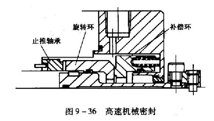 高速機械密封見圖9一36所示,適用于大軸徑及轉速高達10000r/min的情況。由圖中可知,該密封結構的旋轉環(動環)由止推軸承定位,由鍵傳遞轉矩。旋轉環的浮動性好。此結構有兩個優點: